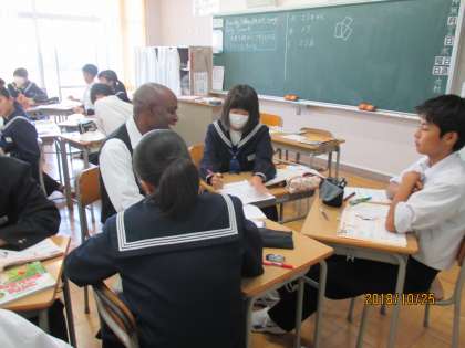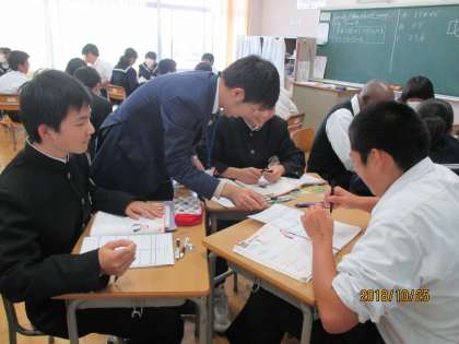 2年生 英語の授業の様子 公開日 2018/10/25 更新日 2018/10/25 2年生 2年生の英語では,友達を電話で誘うという場面の会話について学習していました。グループで,楽しそうに会話をしていました。