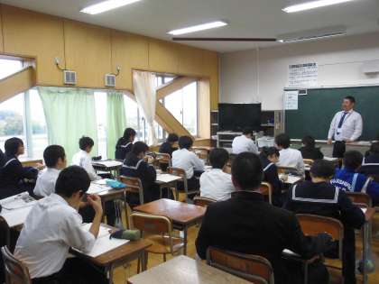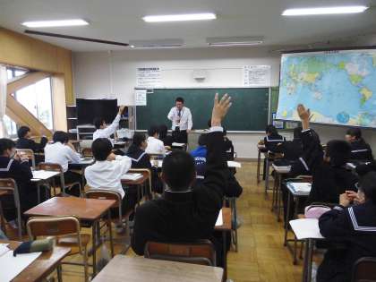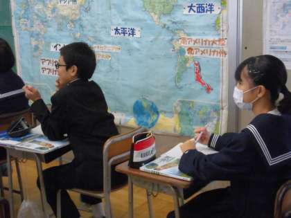 1年生,社会の授業の様子です。地中海地方の農作物について学習しています。教師の問いに対してたくさんの発表があり,楽しく学習していました。