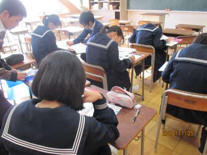 3年生 朝の藤中アカデミー 公開日 2018/11/05 更新日 2018/11/05 3年生 3年生は,県学力診断のためのテストに向けて,「藤中アカデミー」を実施しています。+5点を目標に,生徒達はがんばっています。