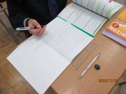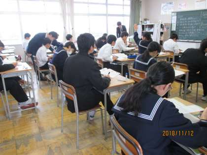 2年生では,接続詞の復習をしていました。真剣にノートに英文を書いている生徒達の様子が見られました。