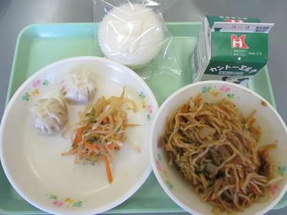 今日の給食の献立は 焼きそば ショーロンポー 中華和え 蒸しパン です。 カロリーは,739㎉です。
