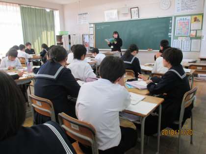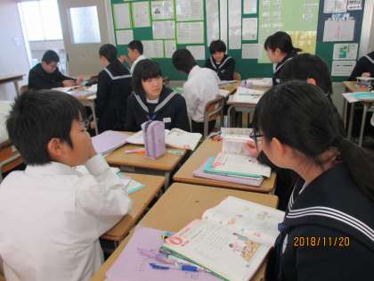 1年生 英語の授業の様子 公開日 2018/11/20 更新日 2018/11/20 1年生 1年生の英語では,「イギリスの本」という題材の学習をしていました。生徒達は,グループの友達同士で英単語の発音を聞き合うなど,楽しそうに学習していました。