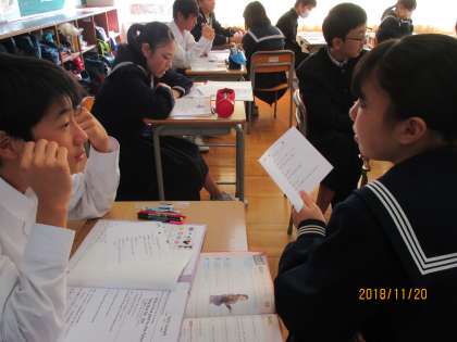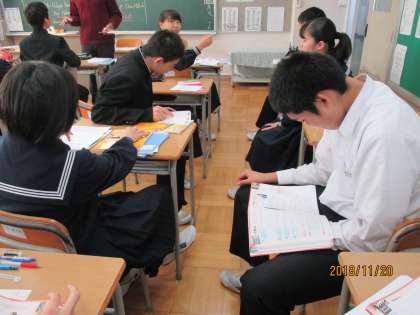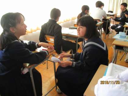 2年生の英語では,英語で道案内をする練習をしていました。案内役と聞き役と,役割を交代しながら練習する生徒達の様子が見られました。