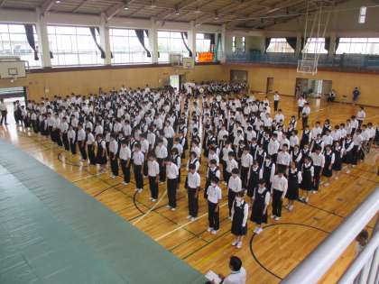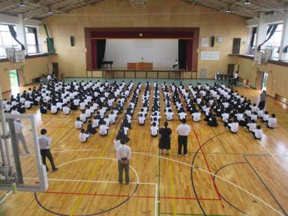 第1学期の終業式を体育館で行いました。今年度より並び方を意識することとしました。式の前に全生徒で前後左右の位置を確認しました。