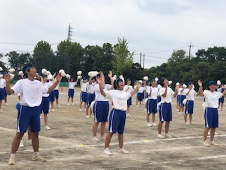 体育祭応援合戦 翔べ!空団 公開日 2019/09/06 更新日 2019/09/06 学校行事 応援団長のよく通る大きな声で元気に入場します。空団の応援には、チームカラーの青色を波に見立て、綺麗なウエーブを作る場面があります。とても綺麗ですので、本番をお楽しみに!