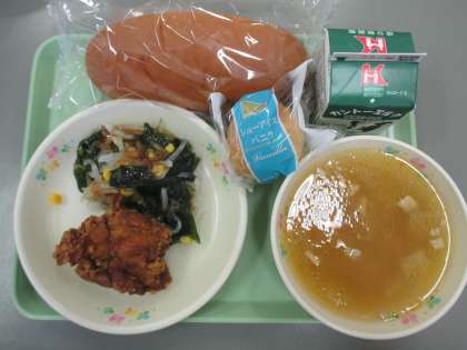 今日の給食 公開日 2019/09/06 更新日 2019/09/06 学校行事 今日の給食の献立は,リクエスト献立・藤代南中学校 です。 ミルクパン 鶏肉のからあげ 海藻サラダ 野菜スープ シューアイス です。 カロリーは,834㎉です。