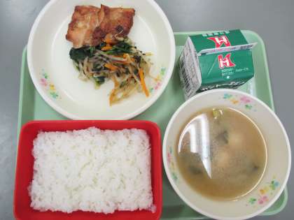 今日の給食の献立は ごはん 鶏肉の香味焼 のり酢あえ だまこの味噌汁 です。 カロリーは,798㎉です。