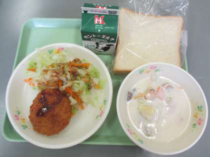 今日の給食の献立は 食パン メンチカツ 添え野菜 さつまいもとウインナーのシチュー です。 カロリーは,885㎉です。