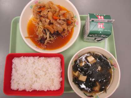 麦ごはん タッカルビ もやしときくらげの和え物 わかめスープ です。