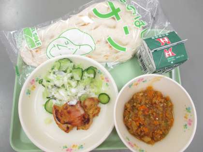 今日の給食 公開日 2019/09/25 更新日 2019/09/25 学校行事 今日の給食の献立は 世界の料理紹介 インド です。 ナン キーマカレー タンドリーチキン グリーンサラダ です。 カロリーは,725㎉です。