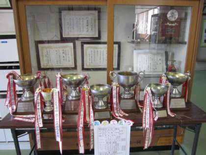 市郡新人戦 公開日 2019/09/27 更新日 2019/09/27 部活動 市郡新人戦で獲得した優勝・準優勝カップを職員玄関に飾っています。また,結果一覧表を生徒昇降口に掲示しました。全校生徒で素晴らしい活躍を喜んでいます。