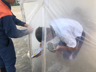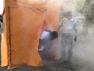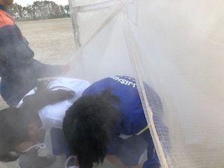煙幕体験もしました 公開日 2019/09/27 更新日 2019/09/27 学校行事 消防署の方から、 1 火事の時は、煙が上にたまりやすいので、姿勢を低くすること 2 煙幕体験の煙に害はないが、火事の時の煙には害があるということ 3 ハンカチは、口と鼻にあてて非難する との注意点を聞いてからの訓練となりました。