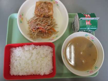 今日の給食の献立は ごはん そぼろあんかけ豆腐 ごぼうサラダ なめこの味噌汁 です。 カロリーは,787㎉です。