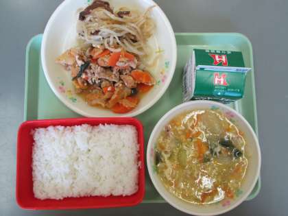 ごはん 豚キムチ炒め やみつきもやし 卵とコーンの中華スープ です。