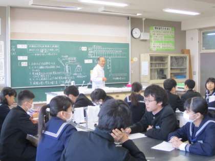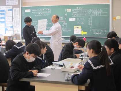 計画訪問(3年生の授業の様子) 公開日 2019/11/18 更新日 2019/11/18 3年生 理科の授業では,「水酸化バリウム水溶液に硫酸を加えていくとどのようなことが起こるのか」という学習課題でグループで協力して課題解決を行っていました。