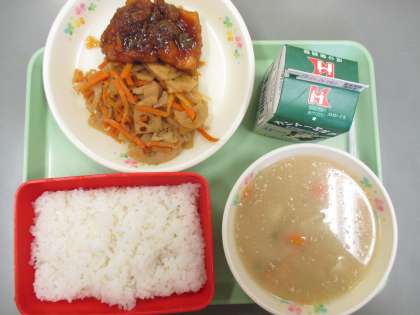 今日の給食の献立は ごはん 揚げ鶏のねぎソースかけ れんこんのきんぴら ごま味噌汁 です。 カロリーは,883㎉です。