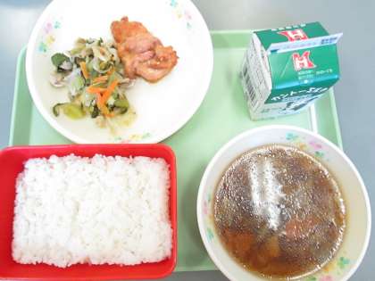 今日の給食の献立は ごはん 豚肉の味噌照り焼き チンゲン菜の炒め物 けんちん汁 です。 カロリーは,824㎉です。