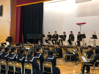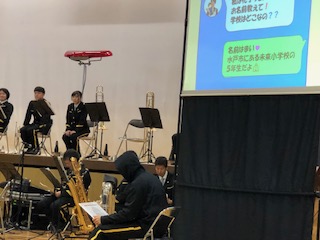 県音楽隊コンサートの中で、最近ニュースにもなっているSNSでのトラブルについて、寸劇を交えて学びました。自分と同じくらいの子からのSNSメッセージがきたとき、相手は大人の男の人かもしれないという話でした。写真を送ったり、住んでいる場所をおしえてしまったりして、最後には会いに来て怖い思いをするお話でした。