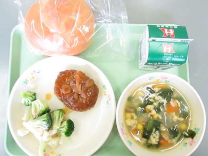 米パン 煮込みハンバーグ 花野菜サラダ 卵とチーズの野菜スープ です。