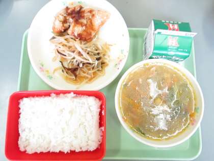 今日の給食の献立は ごはん 鶏肉の香味ソース もやしときくらげの和え物 春雨スープ です。 カロリーは,858㎉です。