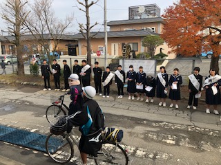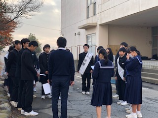 朝の選挙運動がはじまりました 公開日 2019/12/11 更新日 2019/12/11 学校行事 次期生徒会本部役員の選挙の告示があり、選挙運動を兼ねた立候補者のあいさつ運動がはじまりました。 しっかりあいさつをするその姿からは、藤代中学校の代表としてがんばりたいという意気込みを感じました。