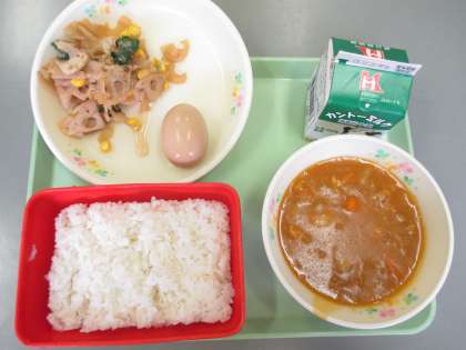 今日の給食の献立は 麦ごはん チキンカレー 煮卵 れんこんサラダ です。 カロリーは,894㎉です。