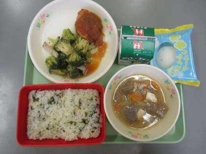 わかめごはん 鶏肉のバーベキューソース ブロッコリーのガーリックソテー 豚汁 大福アイス です。