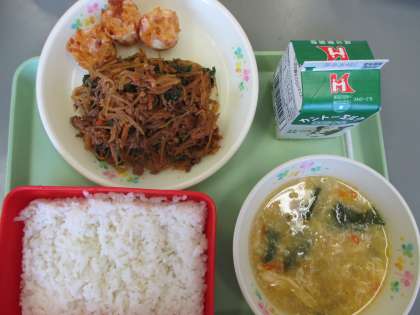今日の給食の献立は 麦ごはん 揚げ豆腐シュウマイ 麻婆春雨 卵とコーンの中華スープ です。 カロリーは,865㎉です。