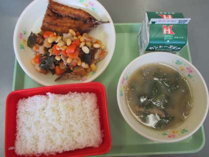 今日の給食の献立は 節分献立 です。 ごはん 鰯の蒲焼き 五目豆 ごま味噌汁 です。 カロリーは,875㎉です。