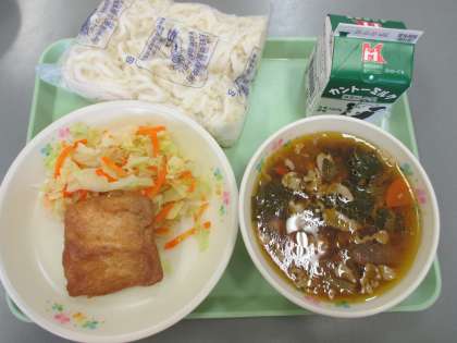今日の給食の献立は 力餅うどん(ソフトメン 五目汁 もちいなり含め煮) 即席漬 です。 カロリーは,818㎉です。