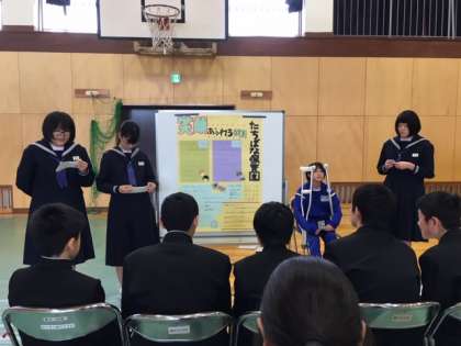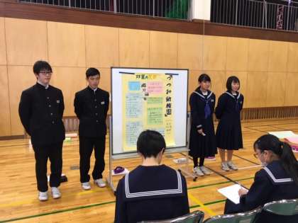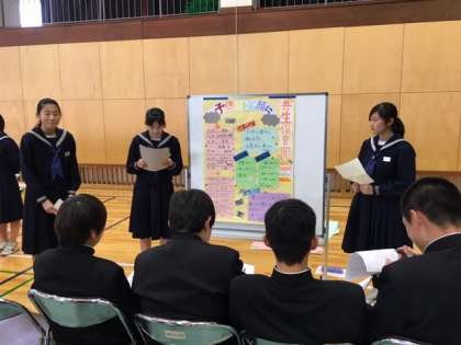 2年生は職場体験での活動についての報告会をしています。活動内容や楽しかったことなどを伝えています。