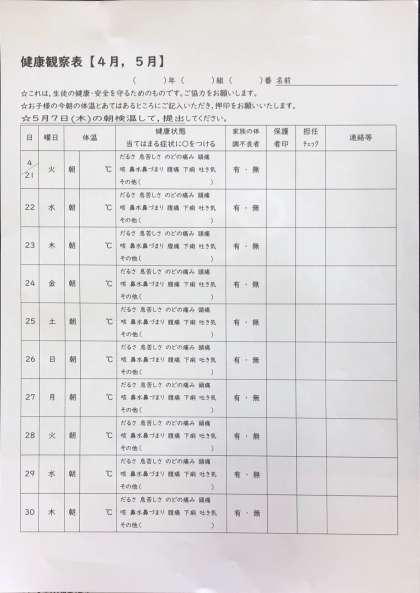 健康観察表を配ります 公開日 2020/04/20 更新日 2020/04/20 学校行事 明日から家庭確認が始まります。 その際に「健康観察表」を配ります。 21日から記入欄がありますので,朝検温したら記録をお願いします。 また,学校再開予定の5月7日にはこの健康観察表を忘れずに持って登校してください。 毎朝の検温をお願いいたします。