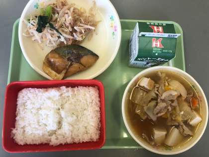 今日の給食の献立は ごはん 牛乳 サバの味噌煮 なめたけ和え いものこ汁 です。 カロリーは,813㎉です。