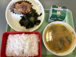 ごはん 牛乳 煮魚 ワカメときゅうりの酢の物 ごま味噌汁 です。