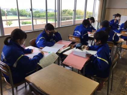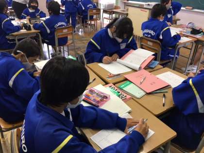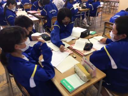 「体験したもの、見たものを詩にしよう」という課題で友達の意見を聞きながら取り組んでいます。