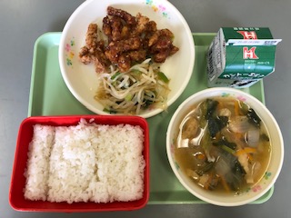 今日の給食の献立は ごはん 牛乳 豚肉のかりん揚げ やみつきもやし 玉ねぎの味噌汁 です。 カロリーは,846㎉です。