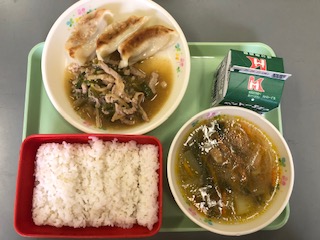 麦ごはん 牛乳 餃子 チンジャオロース 春雨スープ です。
