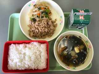 ごはん 牛乳 ビビンバ(肉味噌 ナムル) わかめスープ です。