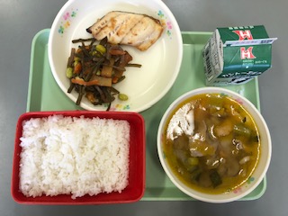 今日の給食の献立は ごはん 牛乳 ホッケの塩焼き 茎わかめの炒め煮 豚汁 です。 カロリーは,754㎉です。