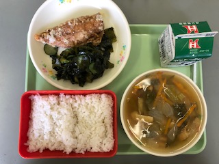 今日の給食 公開日 2021/06/03 更新日 2021/06/03 学校行事 今日の給食の献立は 麦ごはん 牛乳 アジの更紗揚げ ワカメときゅうりの酢の物 玉ねぎの味噌汁 です。 カロリーは,811㎉です。