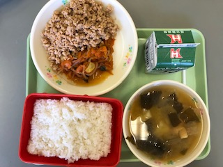 今日の給食の献立は ごはん 牛乳 肉そぼろ 人参と白滝の甘辛煮 じゃが芋の味噌汁 です。 カロリーは,809㎉です。
