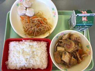 ごはん 牛乳 エビシュウマイ 春雨サラダ 生揚げの中華煮 です。