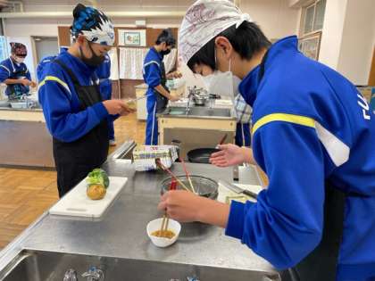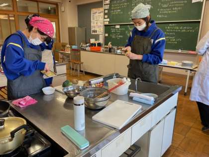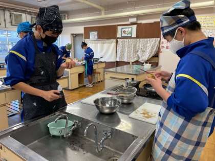 少人数で調理実習をしています。包丁を使ってジャガイモをむいています。