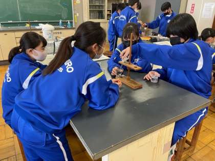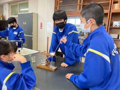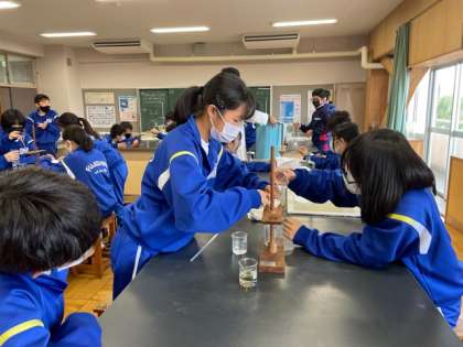 1年生の理科では、ろ過の実験をしています。 グループで協力して進めています。