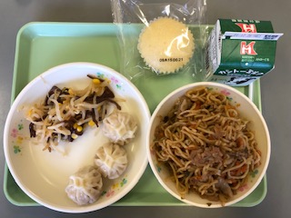 焼きそば 牛乳 ショーロンポー もやしときくらげのサラダ 蒸しパン です。