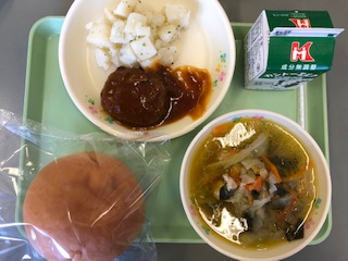 今日の給食の献立は 丸パン 牛乳 煮込みハンバーグ 粉ふきいも ジュリエンヌスープ です。 カロリーは、767㎉です。
