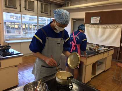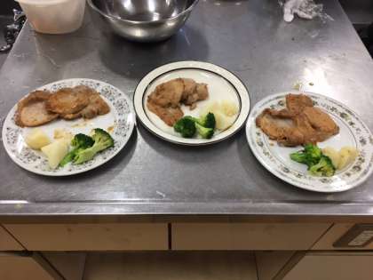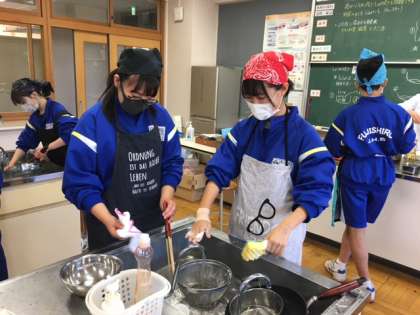 本日は2年2組がしょうが焼きと粉ふきいもを作っています。美味しそうに出来上がりました。