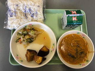 今日の給食 公開日 2021/12/15 更新日 2021/12/15 学校行事 今日の給食の献立は 肉味噌ごまうどん(ソフトメン 肉味噌ごま汁) 牛乳 大学芋 華風和え です。 カロリーは、866㎉です。