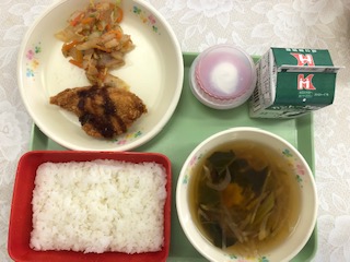 ごはん 牛乳 豚カツ(ソース) おかか和え すまし汁 お祝いデザート です。