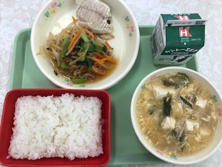 今日の給食の献立は ごはん 牛乳 さばの塩焼き しょうがあえ かきたま汁 です。 カロリーは、779㎉です。